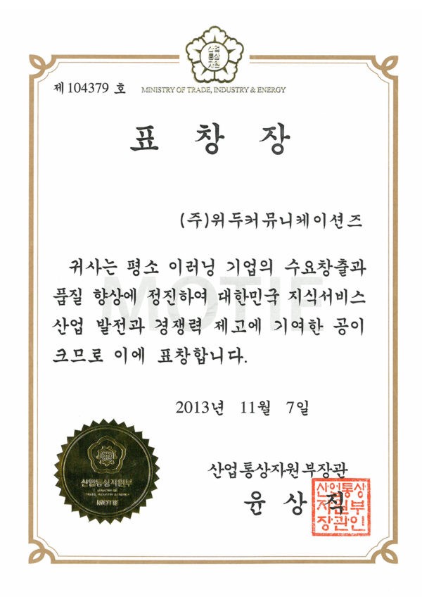 이러닝 기업의 수요 창출과 품질 향상 페이지 정보 작성자 WeDu 댓글 0건 조회 6,102회 작성일 19-05-30 19:32 본문 2013-11-07 표창장 제 104379호 이러닝 기업의 수요 창출과 품질 향상 산업통상자원부장관 윤상직 List Previous한국여성벤처협회 표창장 19.05.30 Next이러닝 콘텐츠 품질 인증 우수 심사 19.05.30