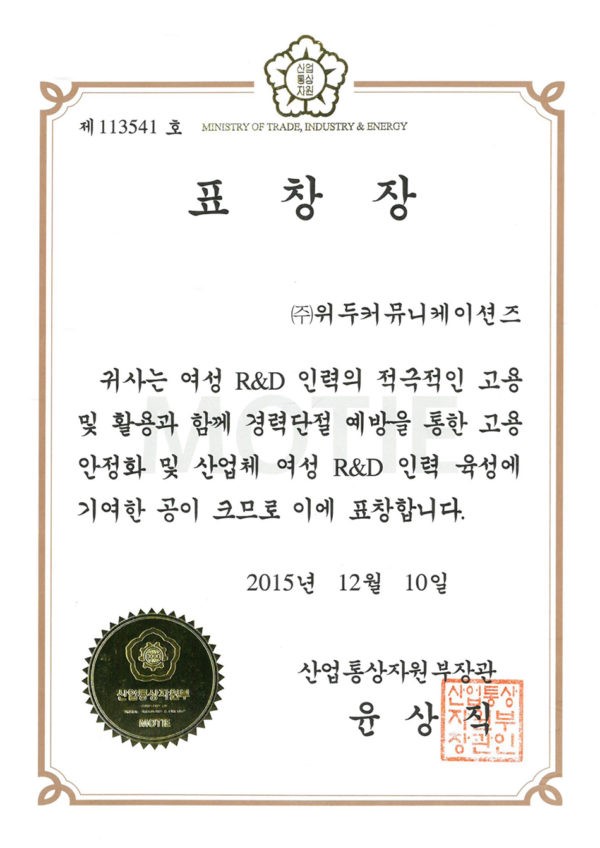 산업통상자원부 표창장 페이지 정보 작성자 WeDu 댓글 0건 조회 6,424회 작성일 19-05-30 19:34 본문 2015-12-10 표창장 제 113541호 여성 R&D 인력 고용 산업통상자원부장관 윤상직 List Previous서울클러스터 어워드 우수상 19.05.30 Next감사장 제 143호 19.05.30
