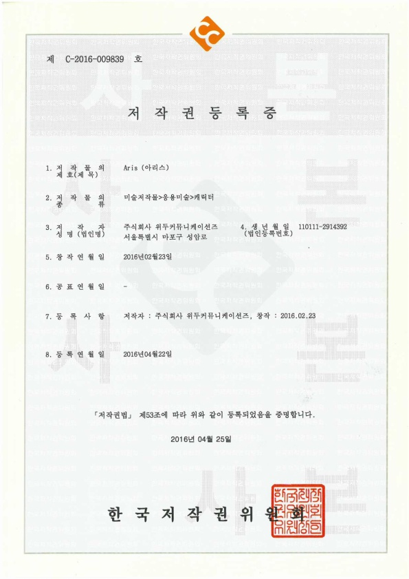 [한국/저작권] 아리스 페이지 정보 작성자 WeDu 댓글 0건 조회 6,470회 작성일 19-05-30 19:09 본문 2016-04-22 저작권 C-2016-009839 아리스 / 미술저작물>응용미술>캐릭터 List Previous[한국/저작권] 필립 19.05.30 Next[한국/저작권] 리안 19.05.30
